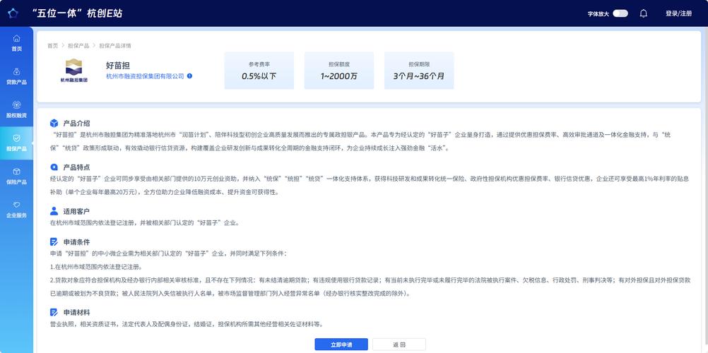 “好苗担”专为经认定的“好苗子”企业量身打造,担保额度最高可达2000万元,担保费率不高于0.5%,担保期限为3至36个月,是杭州融担集团在产品创新方面的一项重要突破。