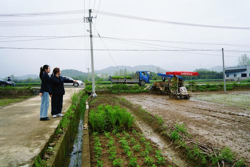 富阳大山村的千亩稻田里,秧苗新绿,生机盎然。旋耕机翻耕土地,插秧机来回穿梭。短短几天,近3000亩水田已全面披上了“绿装”。